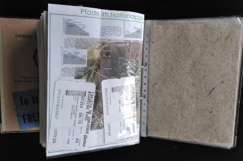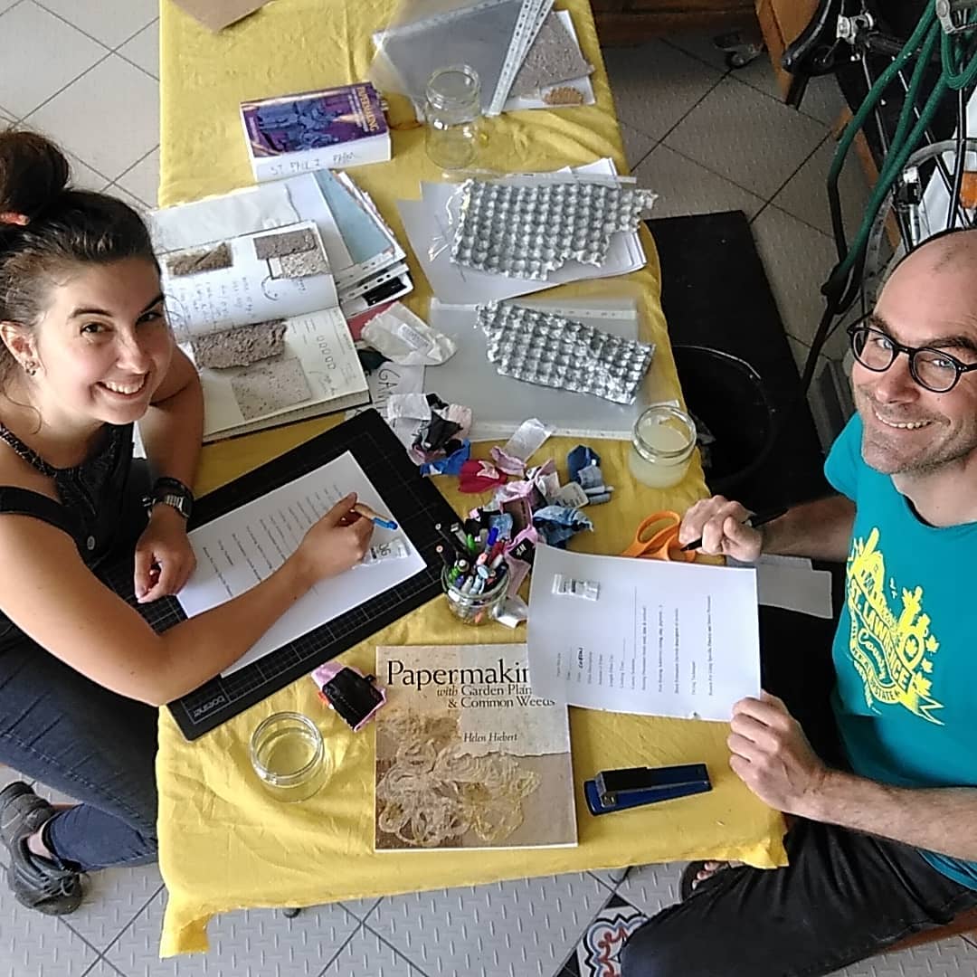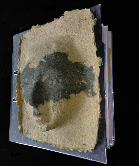 The Recipe and Sample Workbook consists of sheets of handmade paper with fiber samples, recipe logs and brief information regarding the purpose of the paper... for example: refugee papermaking workshop; order of veteran uniform paper; paper made from underwear to benefit LGBTQ organisations...