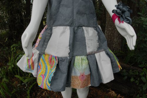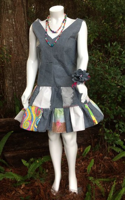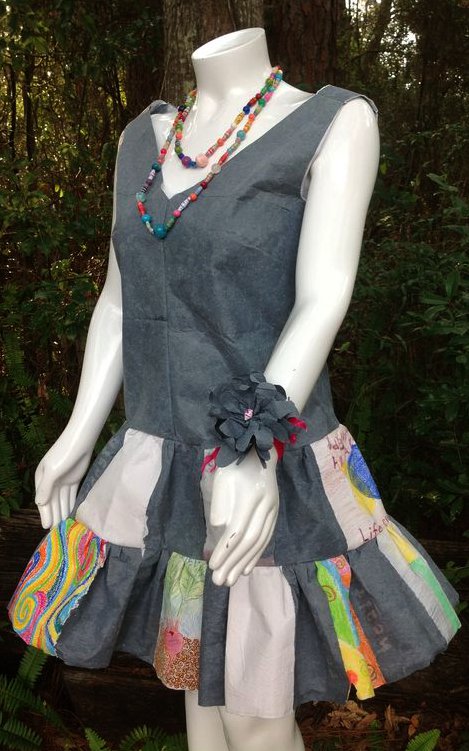 Once the sheets were pressed and dried, the group members drew personal images corresponding to these words. Finally, the sheets of paper were sewn together to become a new garment for our size 16 mannequin. The mannequin was adorned with a necklace of paper beads made from letters that group members wrote to their bodies.